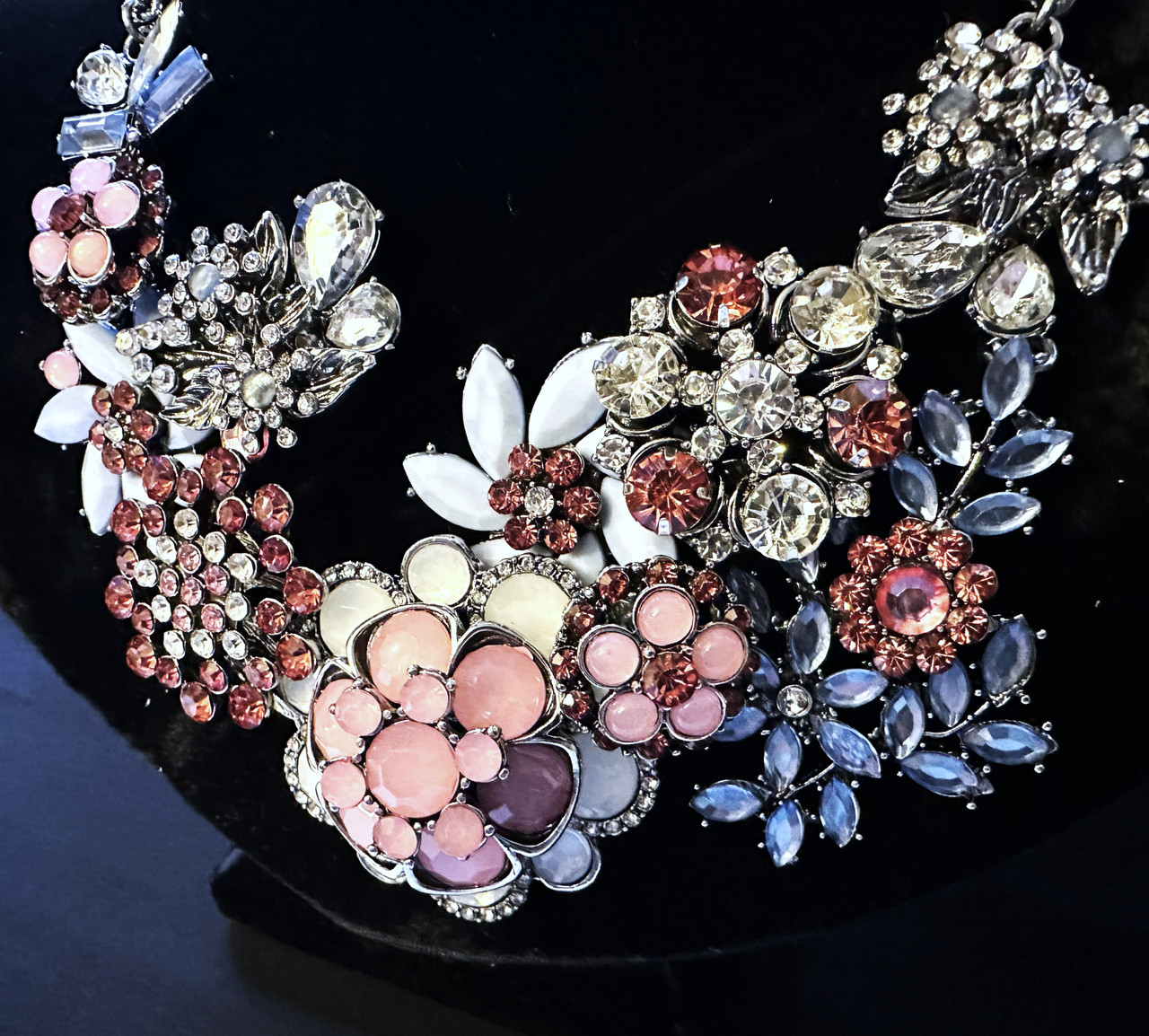 Exquisite Rhinestone Flower Statement Necklace in Pale Blue, Pastel Pink and Opal White