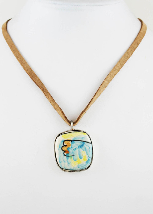 " On the Ocean Beach of Hawaii " Hand Painted Necklace. Hand-painted Ceramic Abstractionist Necklace. 1.2" x 1.2" pendant on a 16" suede cord. Feel the breeze and the sun even if you are miles away.